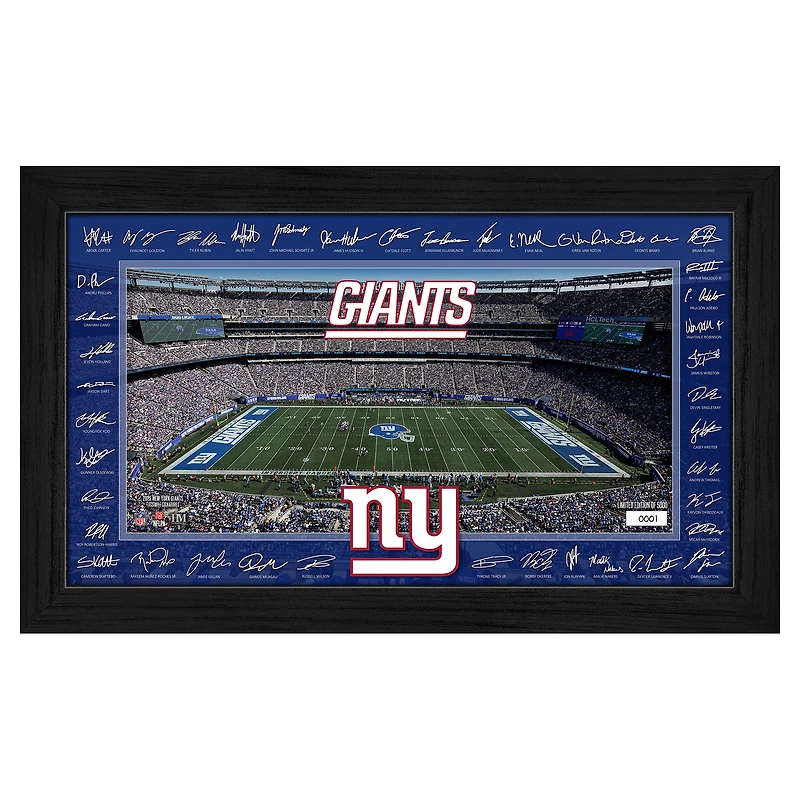 Add a sophisticated touch to your fan cave with this Highland Mint New York Giants 12" x 20" 2025 Signature Gridiron Panoramic Framed Photo. Each limited-edition piece features facsimile signatures of the team, is individually hand-numbered, and includes a certificate of authenticity, ensuring its value and collectibility. This stunning panoramic photo captures the spirit and energy of the New York Giants, making it the perfect centerpiece for any fan's collection.