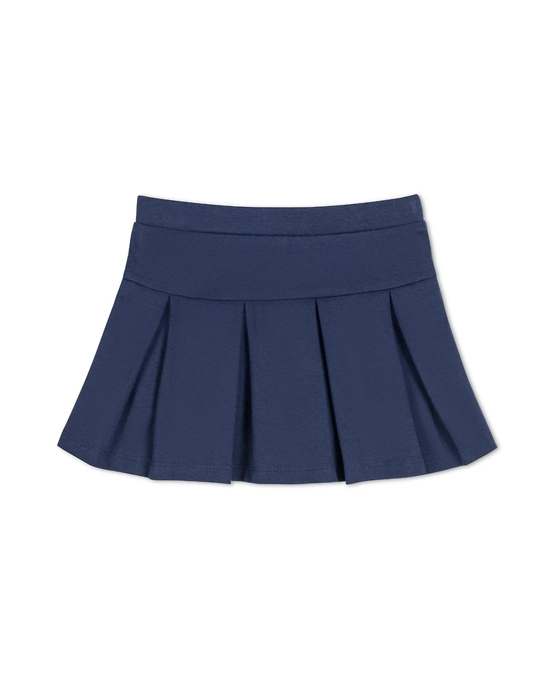 Our drop waist pleated schoolgirl skort in a soft organic cotton blend ponte knit pairs comfort with picture-perfect style. Features preppy pleating, an easy pull-on elastic back waist, and a soft jersey inner short to ensure this look is ready for playtime! Perfect for uniforms.