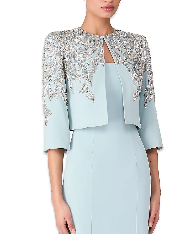 About The Brand:This cropped evening jacket is defined by intricate embellishment that cascades from the shoulders in a leaf-like pattern. The open front and clean neckline keep the silhouette sharp and modern, while the three-quarter sleeves add balance. Its structured shape layers effortlessly over gowns or dresses. A refined finishing piece for formal events or elegant receptions.