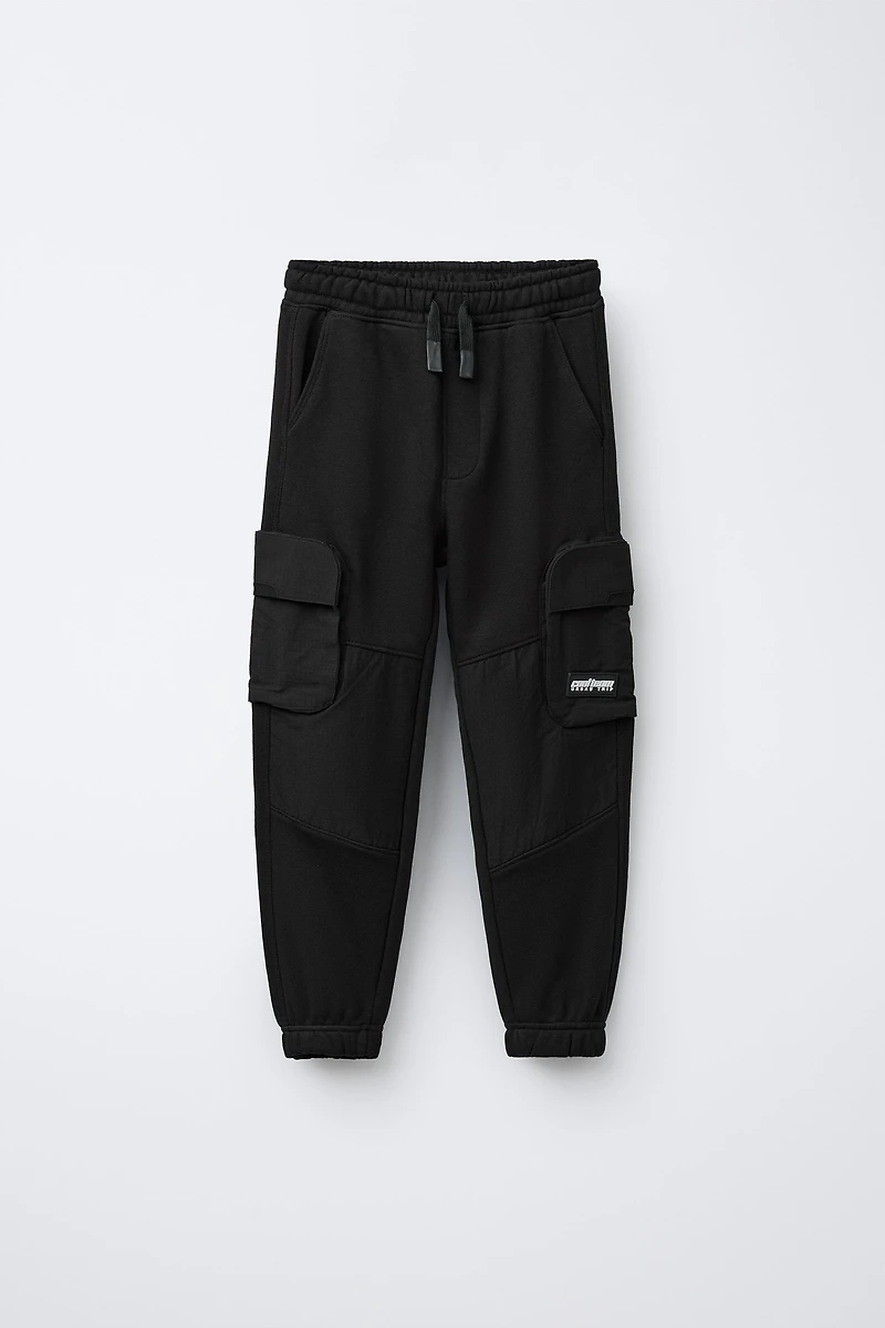 Jogger-style pants with an elastic waistband and adjustable front drawstrings. Front pockets and flap patch pockets at the sides. Elastic cuffs. Fabric with 67% cotton.