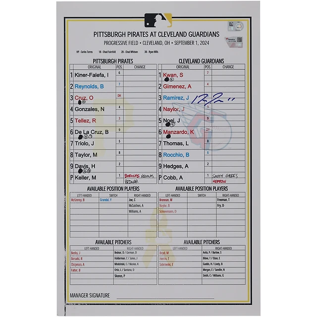 Jose Ramirez Cleveland Guardians Autographed Game-Used Lineup Card vs. Pittsburgh Pirates on September 1, 2024