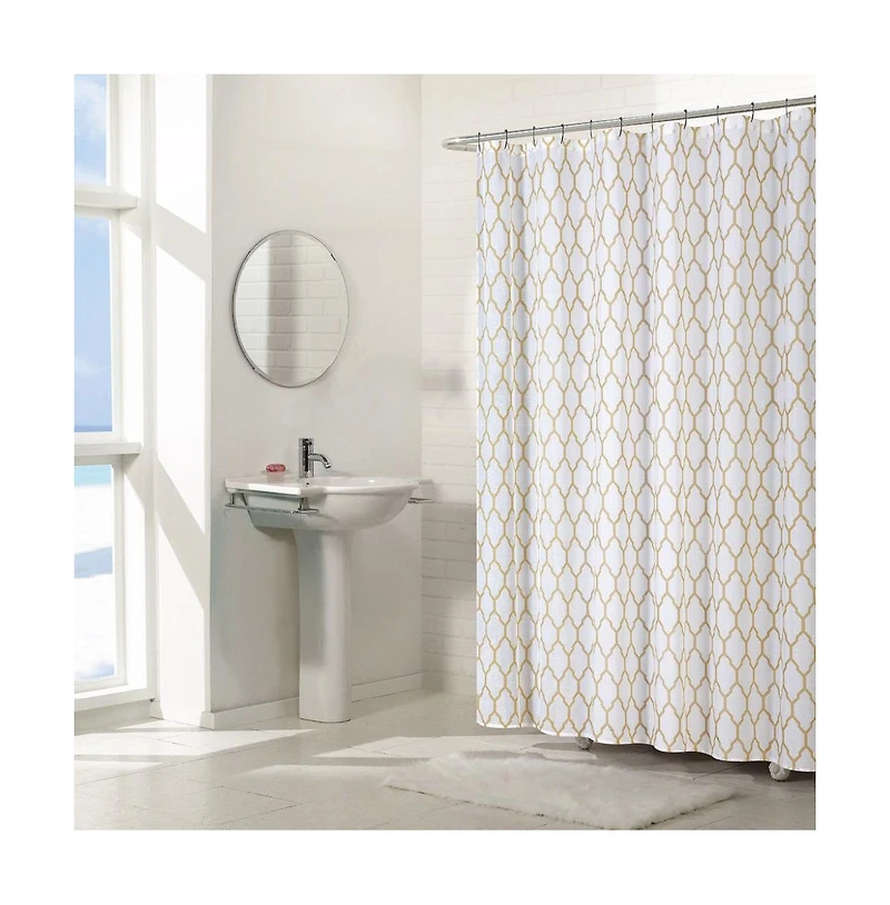 Add modern elegance to your bathroom with this gold and white geometric shagreen design shower curtain. Crafted from durable fabric, it fits standard-sized showers. The stylish pattern enhances any decor, while reinforced buttonholes ensure easy installation. Machine washable for simple care, its perfect for a sophisticated bathroom update.