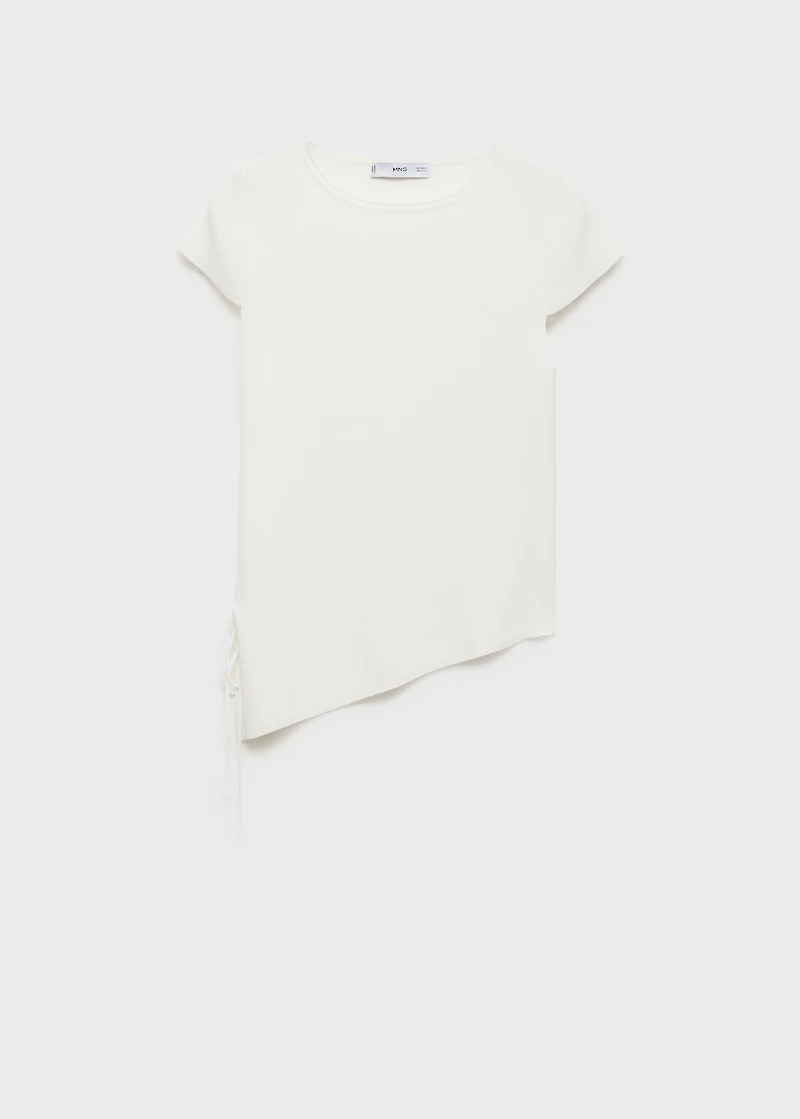 Fine knit fabric. Straight design. Round neckline. Short sleeve. Asymmetric hem. No closure.