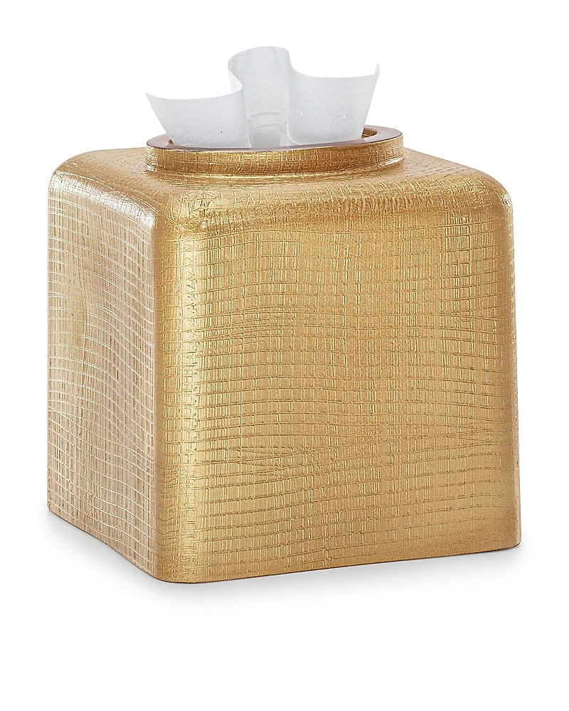This gold tissue cover features hand-painted enamel on mouth-blown glass. Artisans comb the wet enamel to create a subtle "woven" texture.