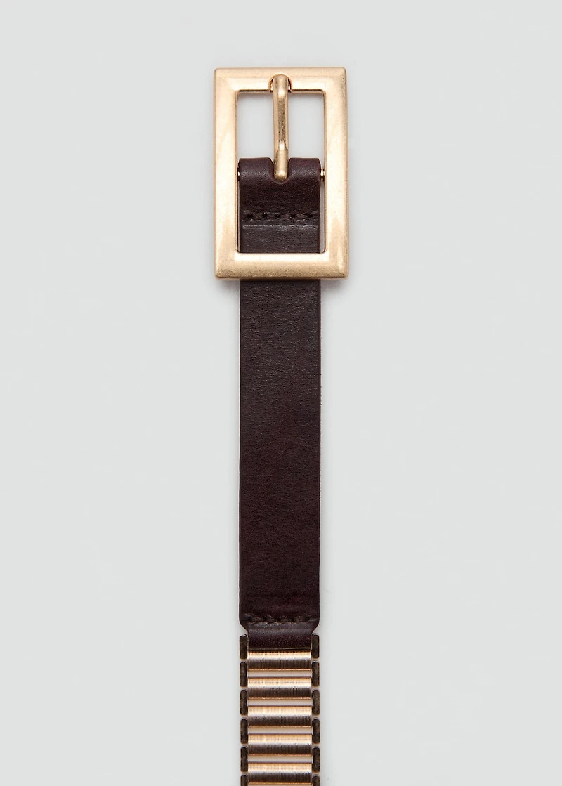 Bovine hide. Combined design. Metallic design. Buckle closure.