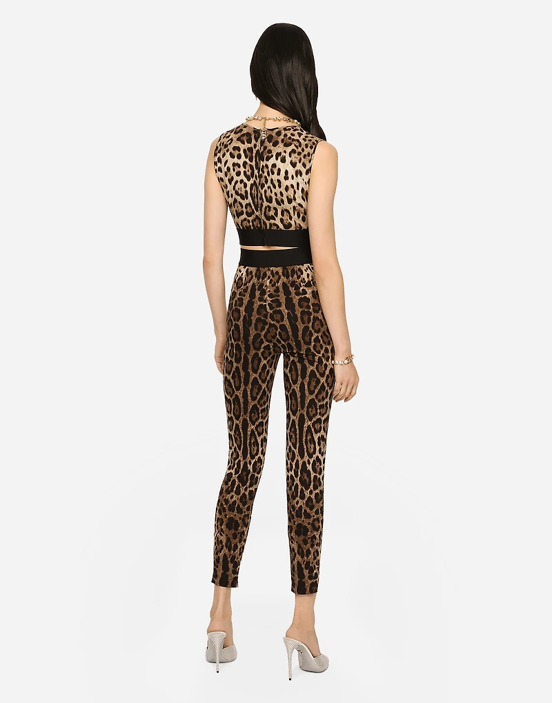 • Leopard-print charmeuse leggings:• Branded stretch Dolce high waist• Inner leg: 74 cm• Hem: 12.5 cm with invisible zipper• Invisible zipper and hook-and-eye fastening• The model is 175 cm tall and wears a size IT 40• Made in Italy