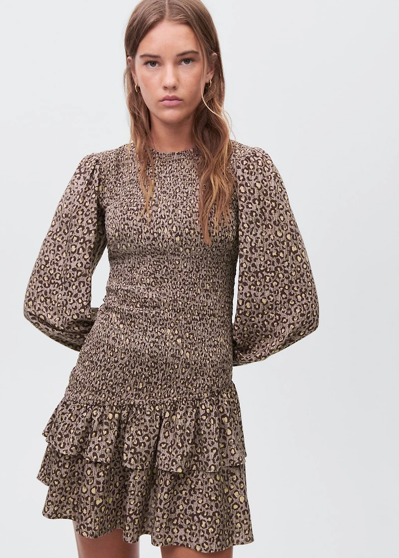 Fluid fabric. Animal print fabric. A-line design. Leopard print. V-neck. Long sleeves with ribbed trims. Button closure at the back. The body of the dress features a honeycomb panel. Frill on the bottom.