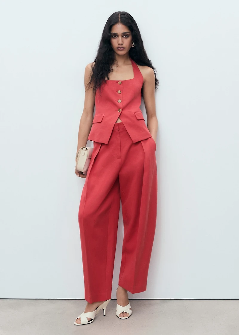 Cotton and linen blend fabric. Suit style. Balloon Design. Mid-rise. Dart detail. Two side pockets. Two welt pockets at the back. Concealed button, hook and zip fastening. 100% cotton lining. Total look. The red color is an online exclusive.