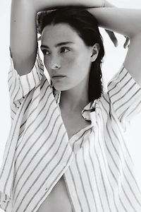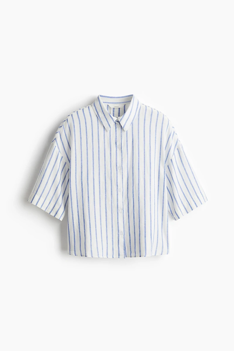 Loose-fit shirt in an airy, woven linen and viscose blend. Collar, buttons at front, and an inverted box pleat at back. Heavily dropped shoulders, elbow-length sleeves, and a gently curved hem.