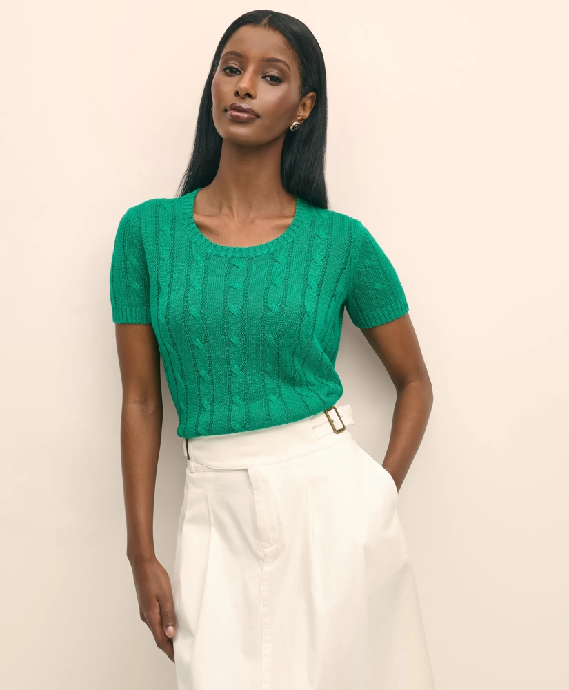 Light, breathable linen in a classic cable knit is just the top for transitional temperatures. We love bold hues paired with chic neutrals for a sophisticated styling statement. Wear this with your skirts and trousers for easy polish. Add our matching cardigan for a coordinated look.