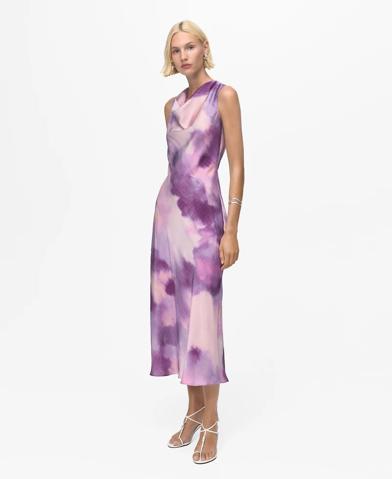 Mango Women's Draped Neckline Satin Tie-Dye Dress
