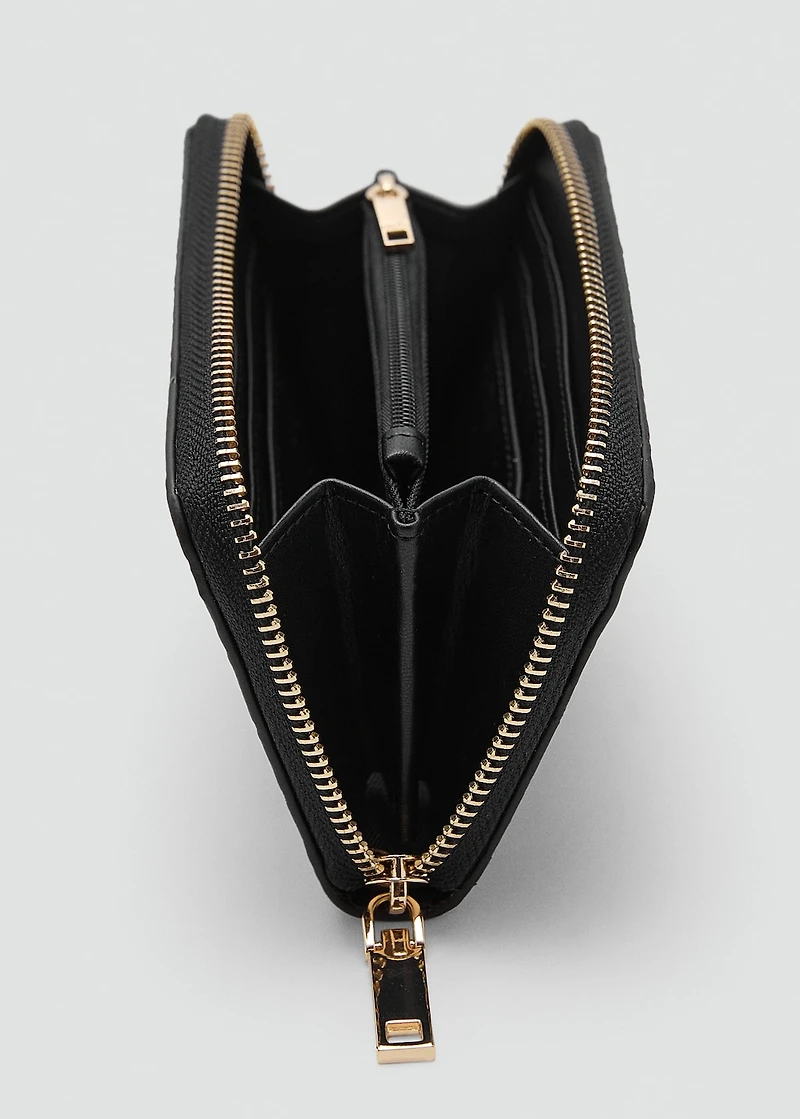 Medium size. Crocodile effect. Inner zipped pocket. Multiple card slots. Zipper closure.