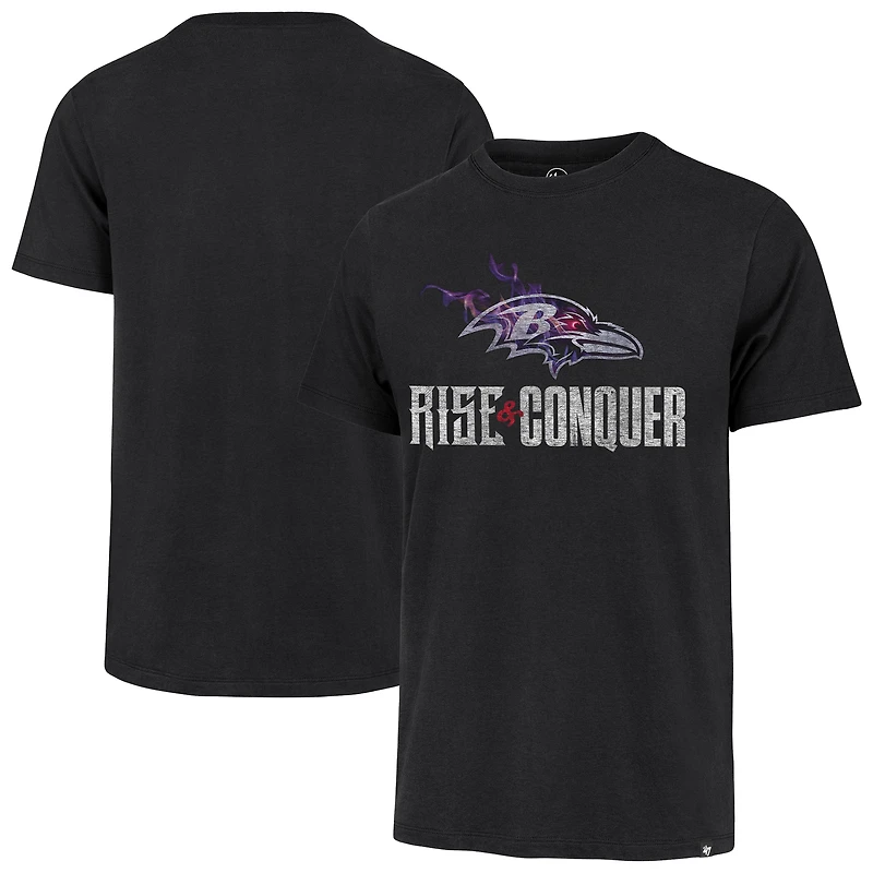 Embrace your Baltimore Ravens fandom with this stylish '47 Rise and Conquer Franklin T-Shirt. This stylish tee features distressed screen print graphics on the chest, adding a vintage vibe to your game day look. Crafted from 100% cotton, this comfortable crew neck shirt is a must-have for any Baltimore Ravens fan looking to "Rise and Conquer" with their team this season.