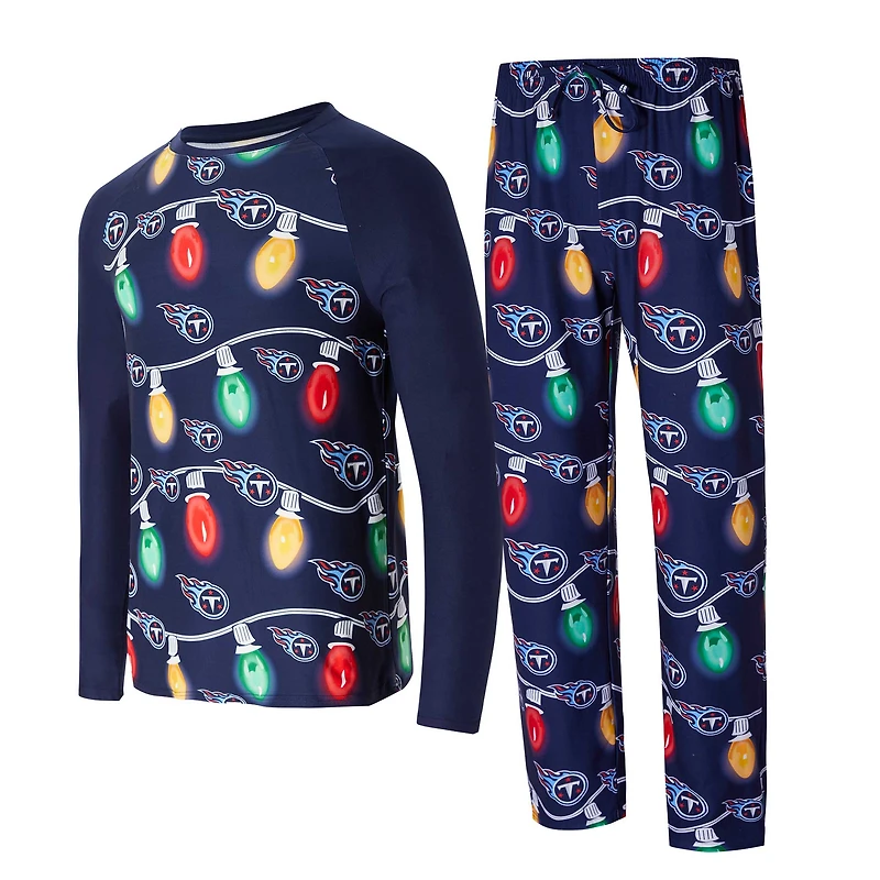 Cozy up for game day and every day with this Tennessee Titans Garland Knit Raglan Long Sleeve Top and Pants Set from Concepts Sport. Made from a comfortable blend of cotton and polyester, this set features raglan sleeves for a roomier, more relaxed fit, perfect for unwinding after a Titans game. With all-over repeating graphics of the team logo and string lights, this festive set ensures you can celebrate your Tennessee Titans fandom in style and comfort.