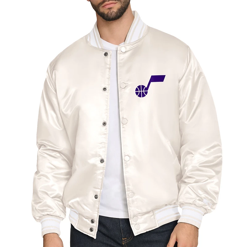 Show out for your Utah Jazz as they take to the court with this Starter Double Team Satin Varsity Jacket. This midweight, full-snap jacket blends a classic varsity design with a smooth, premium box twill satin fabric, making it ideal for moderate temperatures. It features the team logo at the left chest and a jumbo logo displayed across the back, ensuring your fandom makes a bold statement. Complete with striped rib-knit trim, functional side pockets, and a soft interior lining, this jacket delivers both undeniable team pride and all-day comfort.