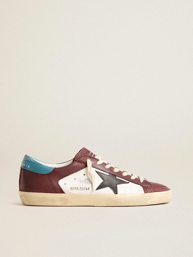 A timeless icon yet one that’s constantly evolving. At Golden, we love taking our classics and reworking them all the time, always from a new angle. These men's Super-Star with a white crackle leather and burgundy upper feature a brown leather star and a teal leather heel tab. And white laces add the finishing touch.