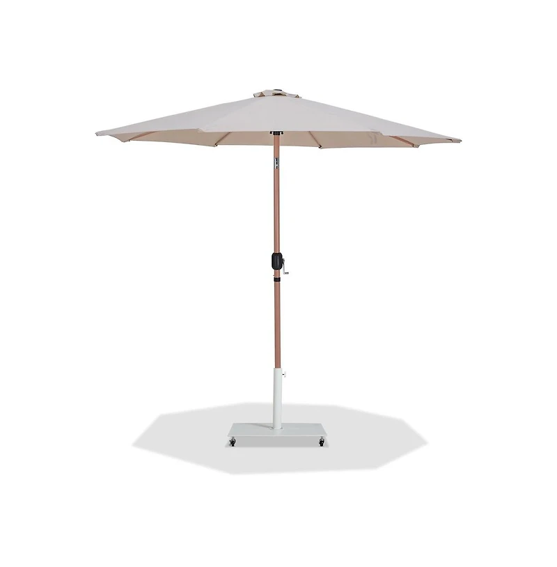 Bask in the shade wherever it's needed when you bring home this Fiji beige fabric and teak aluminum patio umbrella with matte white base set. This ingenious umbrella and base can be used as a standalone umbrella on a deck or patio - or add it to your choice of table for a sturdy solution for hiding from the sun's rays. The aluminum pole weathers the elements like a champ, and the umbrella is crafted from water-resistant fabric for a beautiful, lasting look. Casters on the base make for easy portability.
