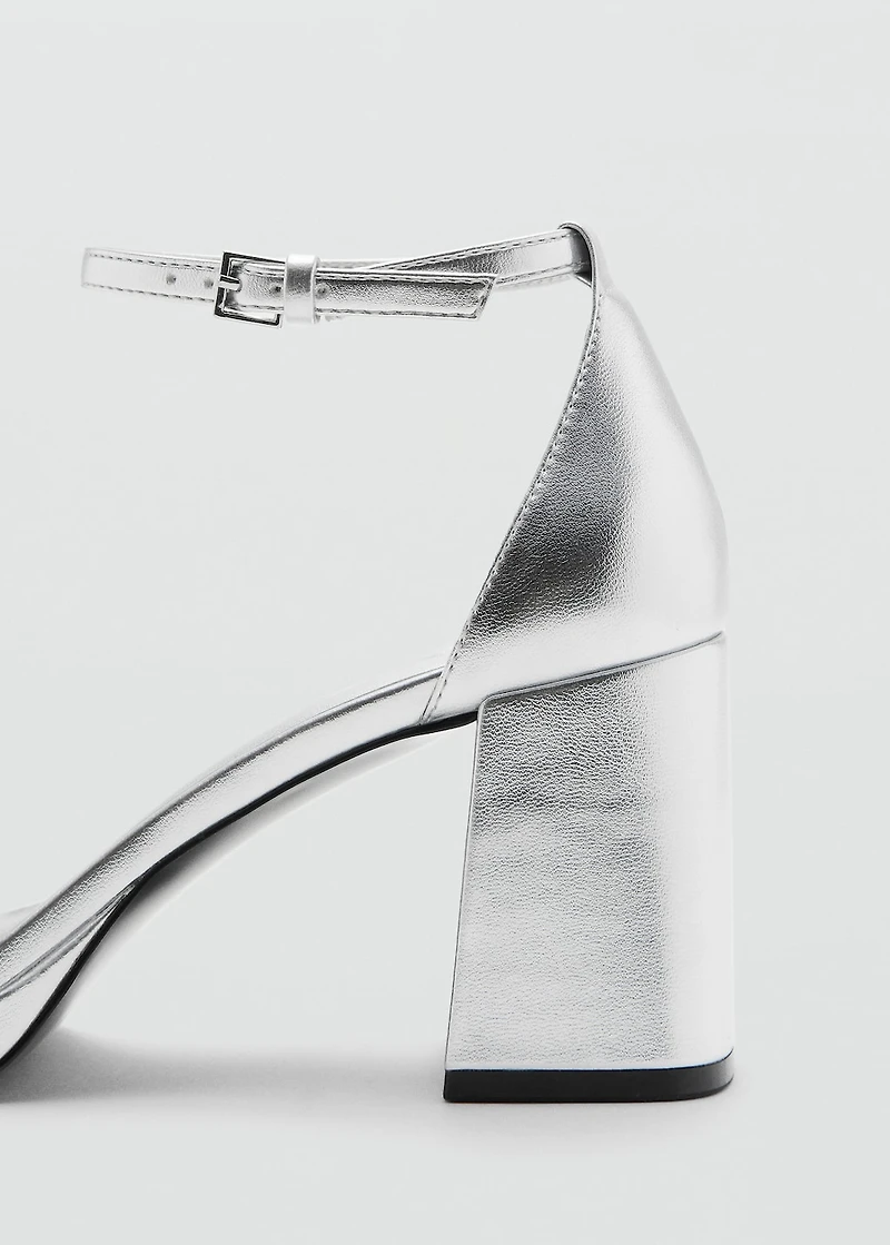 Leather effect. Metallic. Straps design. Buckle closure. Midi heel. 3.15 in heel.