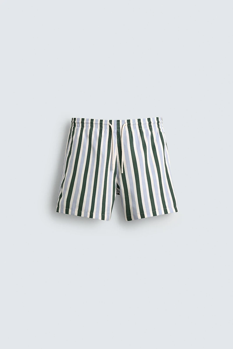 Swimsuit made of technical fabric. Adjustable elastic waistband with drawstring. Side pockets and back welt pocket. Inner lining.