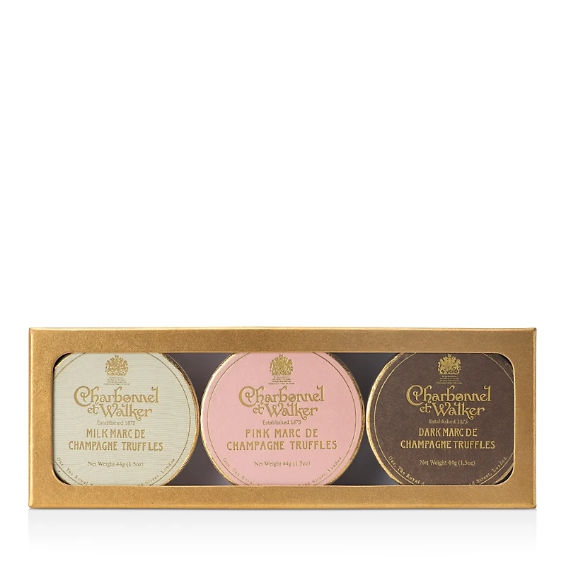 Pink Marc de Champagne Truffles: white chocolate (sugar, cocoa fat, dry whole milk, soy lecithin, natural vanilla flavoring), Milk chocolate (sugar, cocoa fat, dry whole milk, unsweetened chocolate, soy lecithin, natural vanilla flavoring), salted butter (milk), Marc de Champagne, powdered sugar (cane sugar, tri-calcium phosphate), white rum, vegetable juice color, natural flavoring. Milk Marc de Champagne Truffles: milk chocolate (sugar, cocoa fat, dry whole milk, unsweetened chocolate, soy lecithin, natural vanilla flavoring), salted butter (milk), Marc de Champagne, powdered sugar (cane sugar, tri-calcium phosphate), white rum. Dark Marc de Champagne Truffles: bittersweet chocolate (unsweetened chocolate, sugar, cocoa fat, soy lecithin), salted butter (milk), Marc de Champagne, cocoa powder (cocoa powder, potassium carbonate), white rum