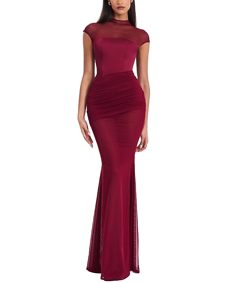 About The Brand:Embrace timeless elegance with the Fabienne Dress. Crafted in a rich burgundy hue, this stunning piece features a delicate mesh collar and chic cap sleeves for a refined look. The luxurious satin top is enhanced with ruched decoration, while the built-in bones provide structured support for a flawless fit. Designed in a dramatic mermaid shape, the dress hugs your curves and flares beautifully for added sophistication. Finished with an invisible zipper for a seamless look, the Fabienne Dress is the epitome of grace and allure, perfect for your most memorable occasions.