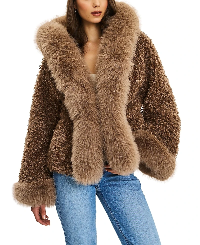 Miss Circle Kali Jumbo Faux Fur Trimmed Teddy Coat with Hood