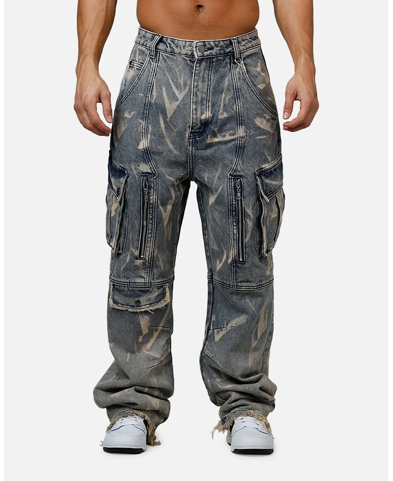 Elevate your fit with the Ultra Baggy Rippled Denim Cargo Pants by mnml. These are designed with our new oversized ultra baggy fit, constructed from 100% cotton denim with a vintage acid wash, oversized pocketing and zippers, and double stitched western lining.