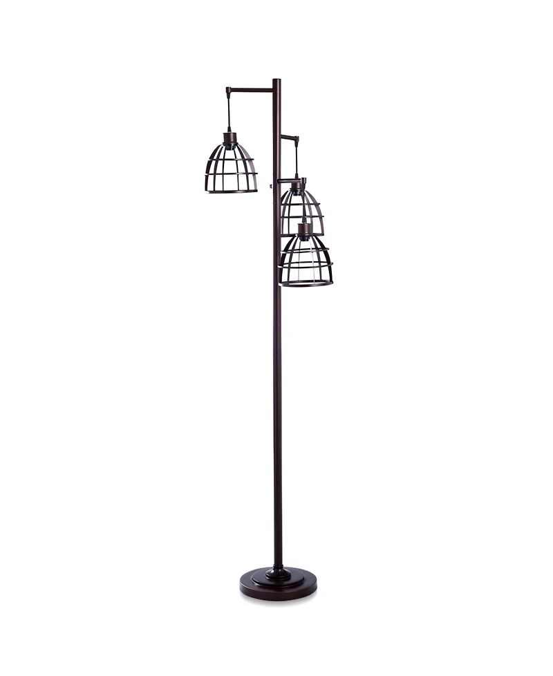 The Niki Floor Lamp is a stunning example of industrial-inspired design with its rubbed bronze metal frame and three lamps of varying heights, each encased in a black metal cage shade. The open metal mesh of each shade allows the bulb inside to be seen.