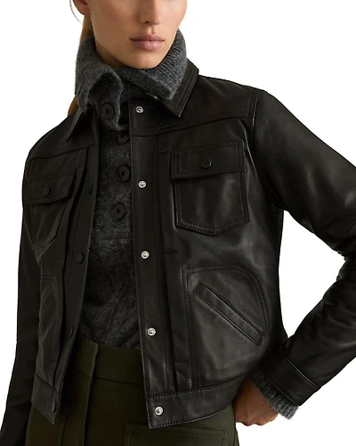A luxurious twist on a utilitarian staple, this leather jacket borrows its silhouette from classic trucker jean jackets. We kept the pocketing, snap buttons, and top-stitch detailing of the original, and rendered it in premium nubuck leather, made in one of the world's most renowned ateliers. Plus, since it's nubuck, it will only get better with time, developing a rich and unique patina. Slim Fit: Fitted. Sits close to the body with a straight silhouette. Spread collar with snap closure. Chest pockets with snap closure. Side pockets. Two interior pockets. Unlined body, lined sleeves for easy on-off. Slim Fit: Fitted. Sits close to the body with a straight silhouette. Long sleeves. Hip length. Model: Size M, 6'2"