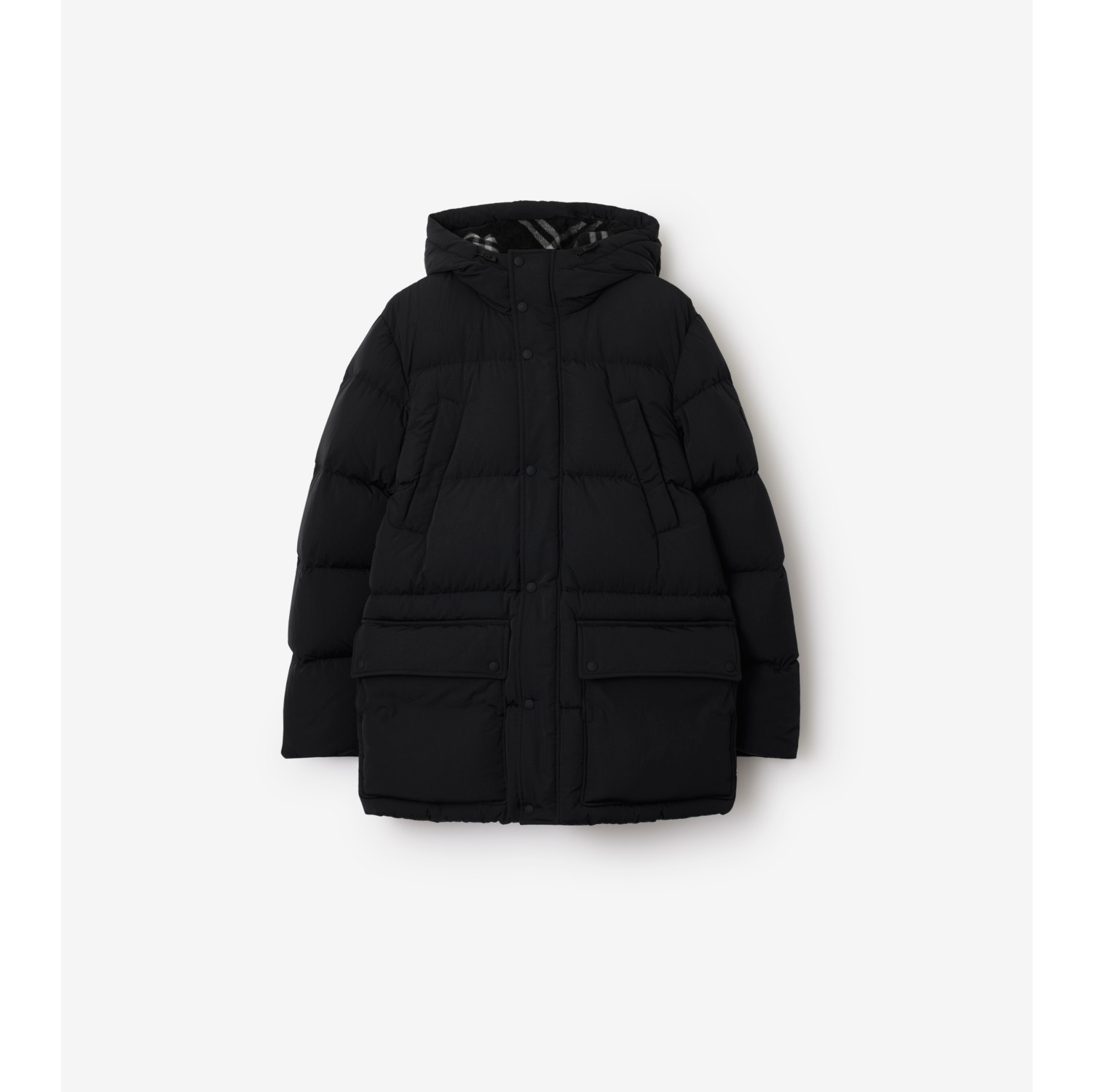 A hooded puffer jacket in water-repellent nylon filled with goose down and insulating fibres, appliquéd with our B shield at the sleeve. Cut to a relaxed fit, the style is lined at the collar and hood with Burberry Check wool. Part of Burberry Classics, wardrobe foundations with a unique Burberry slant. Zip and press-stud closure Drawcord hood Chest zip pockets, side press-stud flap pockets Storm cuffs Appliquéd B shield at sleeve