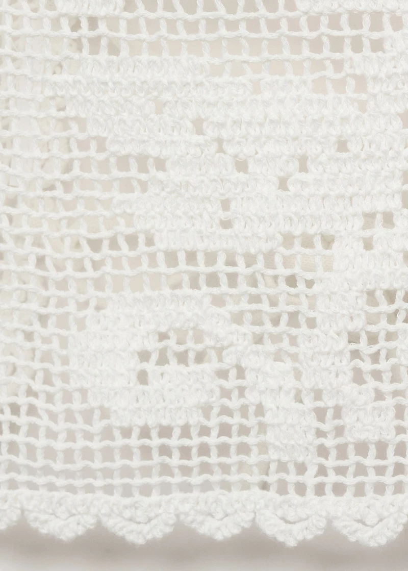 Crafted in crochet fabric, this fitted sleeveless design features thin straps and an open back with a bow closure, offering a unique and sophisticated style.