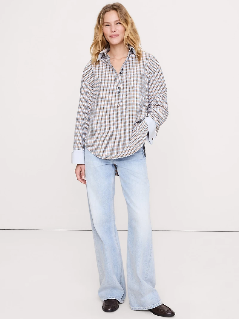 Also known as a "Banker collar" shirt, we reimagined this classic silhouette with its distinctive contrast collar and cuffs as an oversized tunic, in our signature 100% cotton poplin. Oversized fit: Extra room through chest, shoulders, and waist. Dropped shoulder seams. Point collar with button placket. Chest pocket. Shirttail hem. Oversized fit: Extra room through chest, shoulders, and waist. Dropped shoulder seams. Long sleeves. Tunic length.