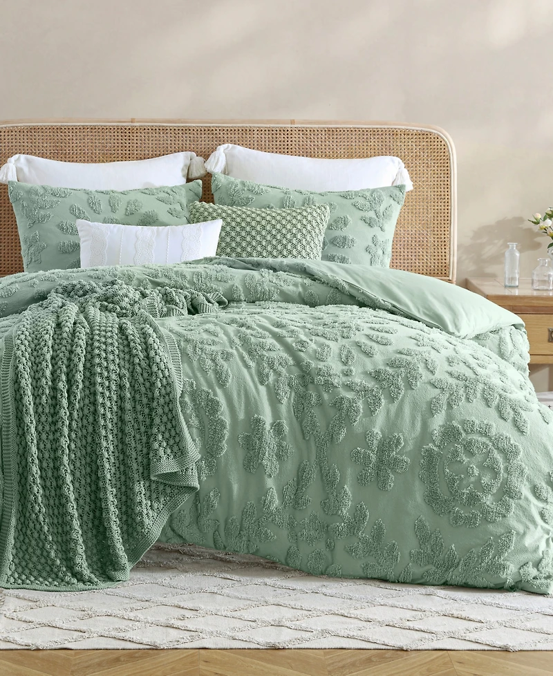 Soft feels, dreamy texture, and nature inspired style are all in the details of the Peri Home Chenille Laurel bedding set. The comforter set is cotton with a chenille face featuring laurel plants in a medallion arrangement.