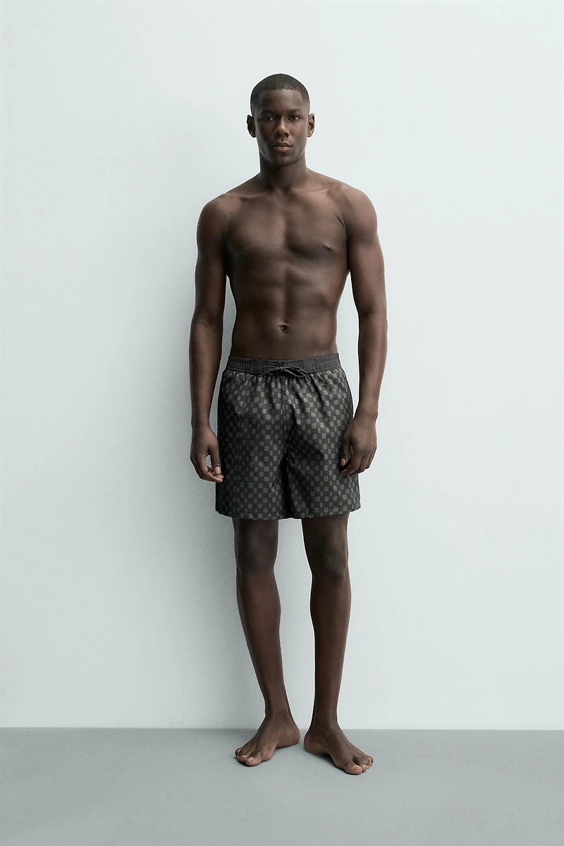 Swimsuit made of technical fabric. Adjustable elastic waistband with drawstring. Side pockets and back patch pocket detail. Inner lining.