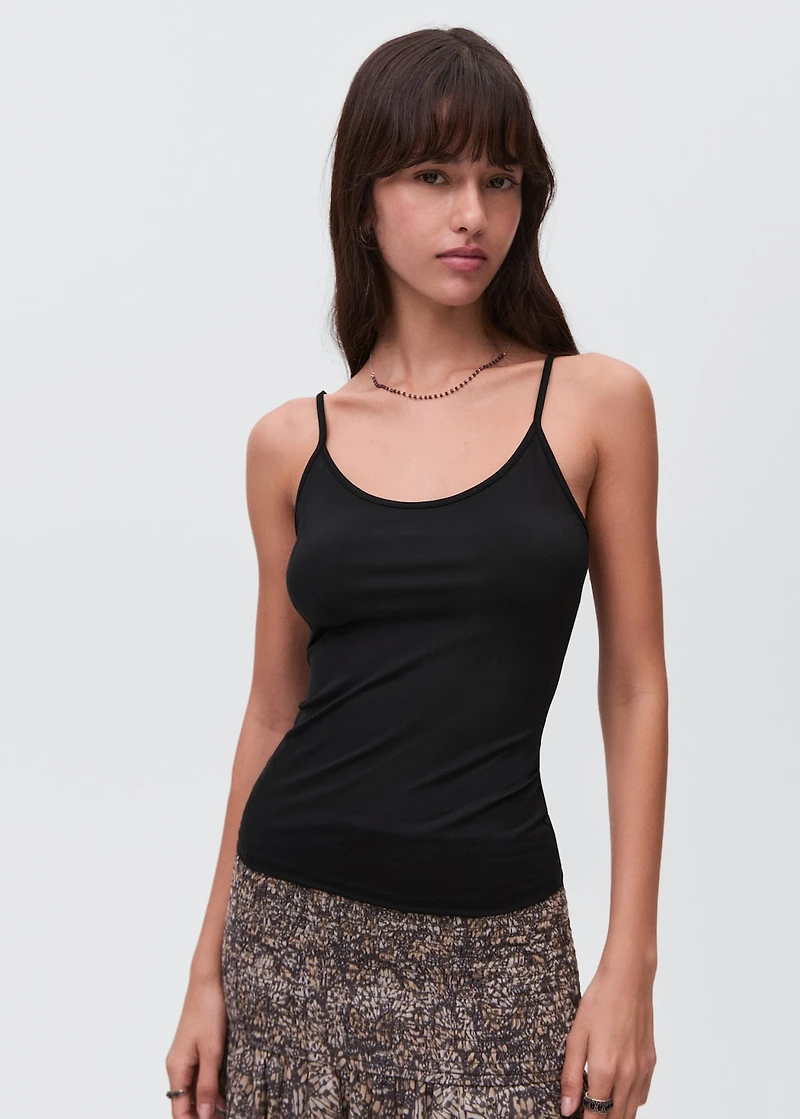 Stretch fabric. Polyamide fabric. Plain design. Straight design. Round neck. Thin straps.