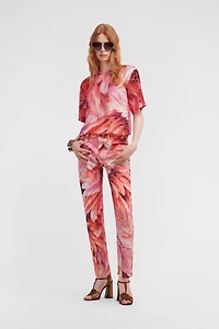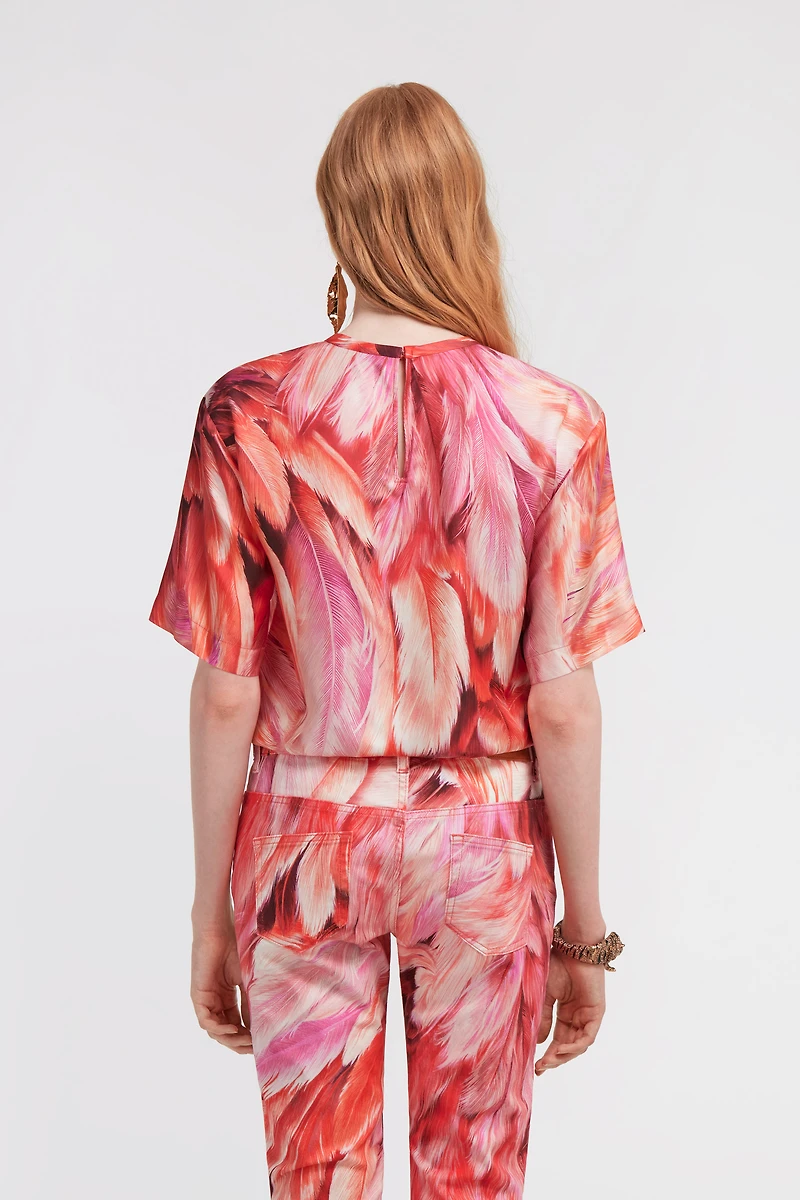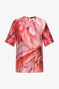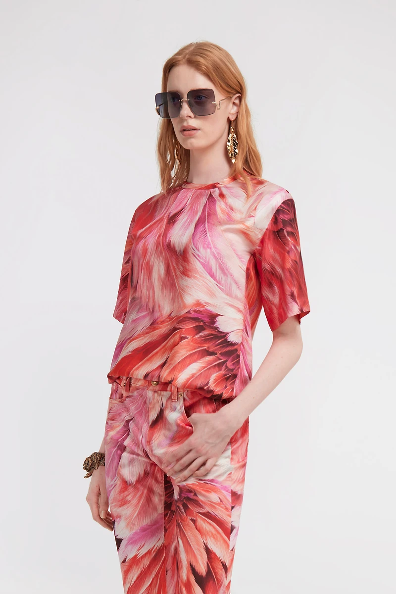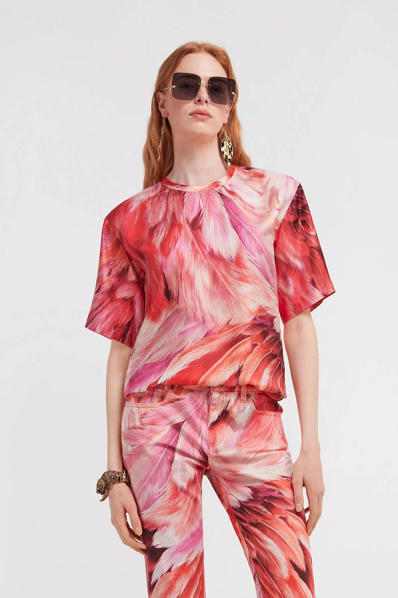 Floating and vibrant, this silk T-shirt is enveloped in the hypnotic Plumange print, a riot of feathers in shades of red and pink. The lightness of the silk caresses the skin, offering a sensation of pure luxury and comfort. A piece that captures the vibrant essence of Roberto Cavalli, perfect for adding a touch of sophisticated colour to the wardrobe. The model is 178cm / 5'10" tall and wears size S / 40 IT.