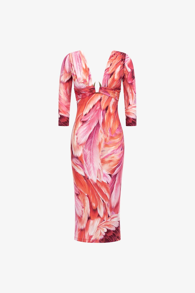 Embrace the ethereal allure of the Plumange print, a vibrant cascade of feathers that seems to float across the silhouette of this midi dress. The fluid, body-hugging lines are enhanced by elegant draping and a deep V-neck, culminating in a signature metal hardware detail that adds a touch of Cavalli's iconic glamour. This dress is a masterpiece of feminine power and artistic expression, designed to captivate and enchant at any high-profile event. The model is 178cm / 5'10" tall and wears size S / 40 IT.