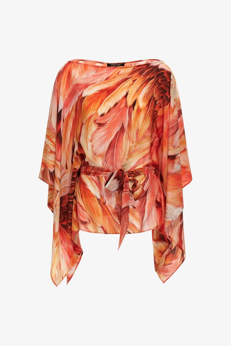 Embrace the vibrant allure of the Plumange print with this exquisite silk blouse. Crafted from pure silk that cascades fluidly over the form, it features dramatic wide sleeves and an artful feather motif in warm, captivating hues. A delicate tie belt cinches the waist, creating a flattering contrast to the blouse's relaxed, flowing silhouette. This piece embodies effortless elegance and Cavalli's signature boldness. The model is 178 cm / 5'10" tall and wears size S / 40 IT.