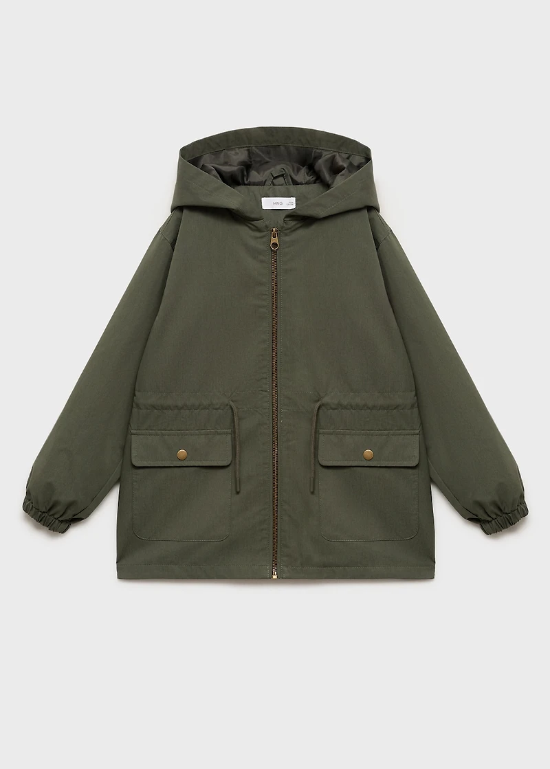 Cotton fabric. Plain design. Trench design. Hood with lining. Long sleeves with elastic cuffs. Two front welt and flap pockets. Adjustable drawstring waist. Zipper closure.
