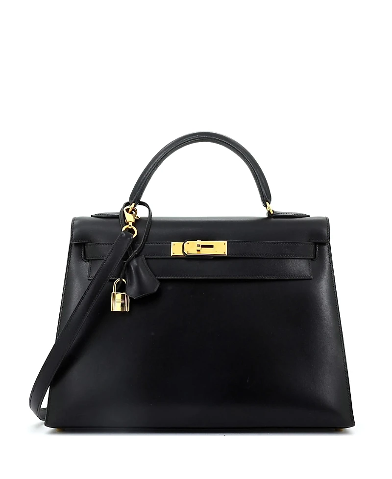 Shop Pre-Owned HERMES Kelly 32 Handbag Black Box Calf with Gold Hardware in Los Angeles, CA