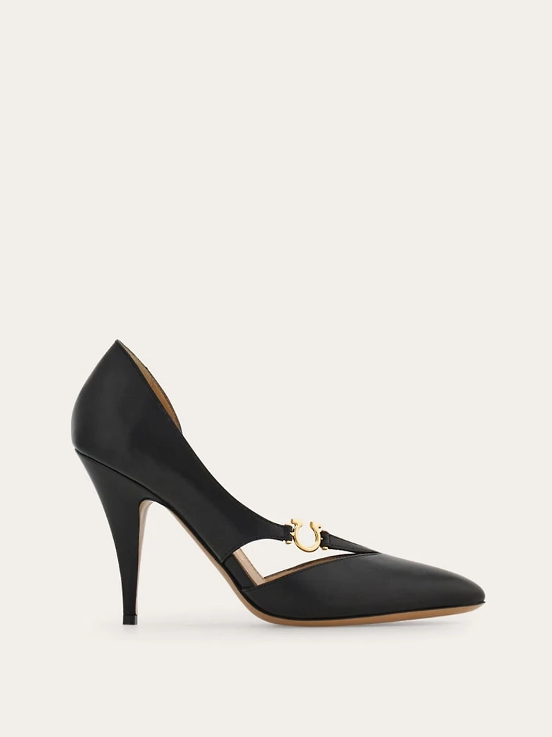 With its foot-framing cutout and elegantly cut, rounded vamp, this new d'Orsay pump fuses vintage and contemporary elements. It's set on a tapered heel, modeled on retro designs, and finished with the signature golden Gancini for a precious touch.