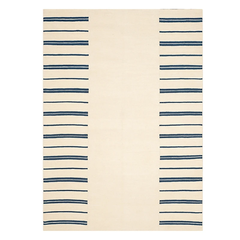 Breezy coastal style is evoked in Sagaponack Stripe Patch, a flatweave rug from Ralph Lauren Home. Hand-woven in a casual wool texture that complements transitional and contemporary interiors, this rug is structured into columns of stripes with a central panel in the solid ground color.