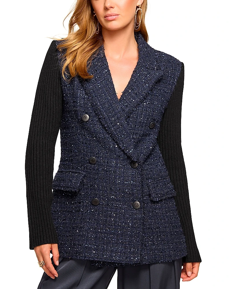 Ramy Brook Elsa Blazer.Color:Navy Tweed.Size:XXS.Material:Shell: 40% cotton/30% acrylic/21% polyester/5% metallic polyester/3% other fibers/1% nylon; lining: 97% polyester/3% spandex; yarn: 100% wool.
