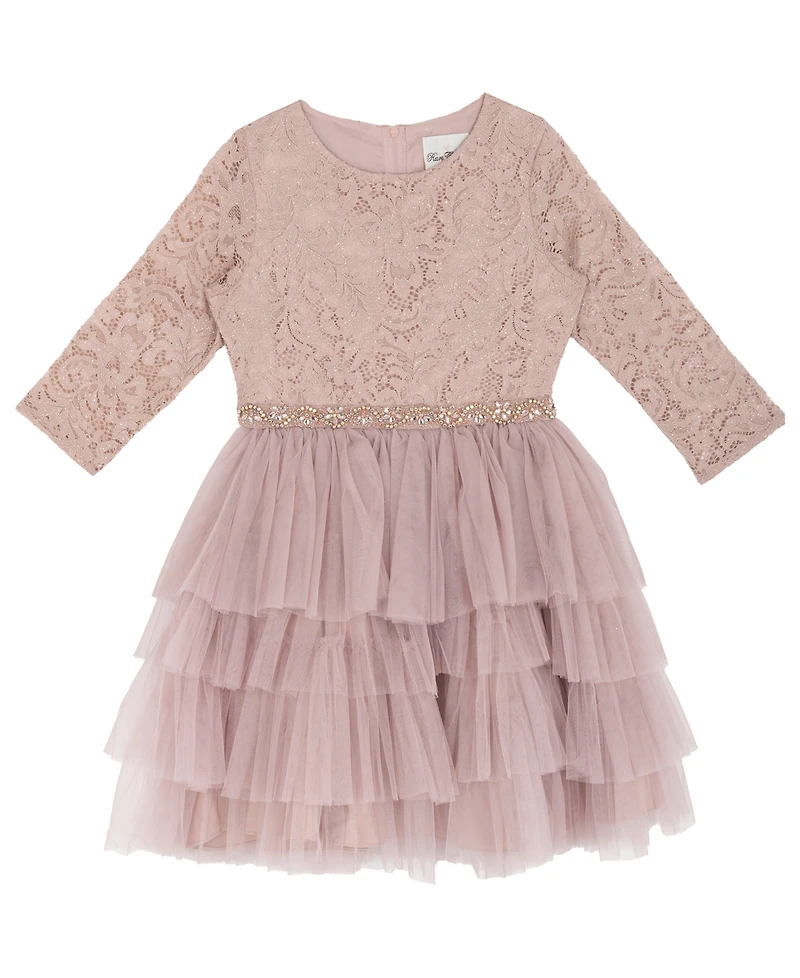Let her shine with storybook elegance in this Rare Editions dress, detailed with a glittered lace bodice and a jeweled waist. A tiered mesh skirt completes the look with soft movement and fairy-tale charm.