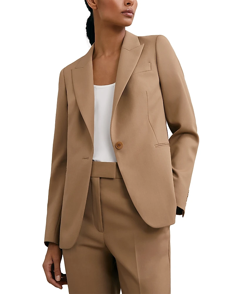 Reiss Jade Peak Lapel Blazer.Color:Camel.Size:6 UK/2 US.Material:50% wool/48% polyester/2% elastane; body lining: 51% cotton/49% polyester; sleeve lining: 70% viscose/30% polyester.