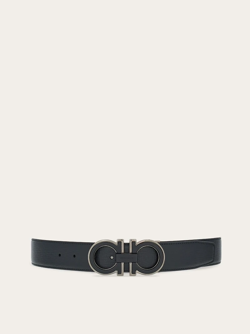 An iconic symbol of the brand, the double-layer Gancini detail becomes an elegant buckle with a contemporary edge, thanks to the pairing of burnished metal with total black paint. The soft, natural-grain calfskin belt has been hand-crafted to emphasize its natural softness and lush feel. Reversible, two-tone construction for two ways of wearing it and an The adjustable length allows for a more personalized fit and style. We invite you to check our size guide for more information.