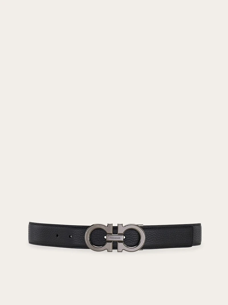 A modern take on Ferragamo’s most iconic belt, featuring a reversible two-tone design for ultimate versatility. The Gancini buckle in a ruthenium finish is refined with vertical knurling for a distinctive touch. The adjustable length allows for a more personalized fit and style. We invite you to check our size guide for more information.