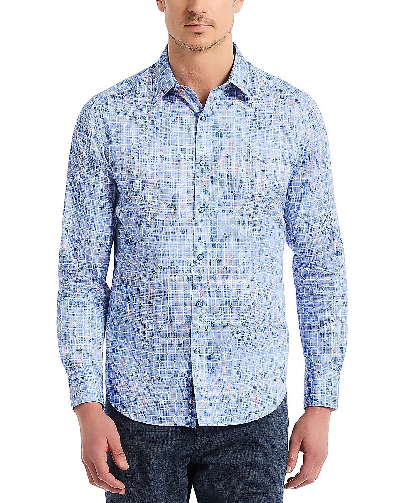 This standout Robert Graham shirt combines artistic flair with modern sophistication. The abstract multi-colored background creates a vibrant canvas, while a simple grid print overlay adds a geometric twist.