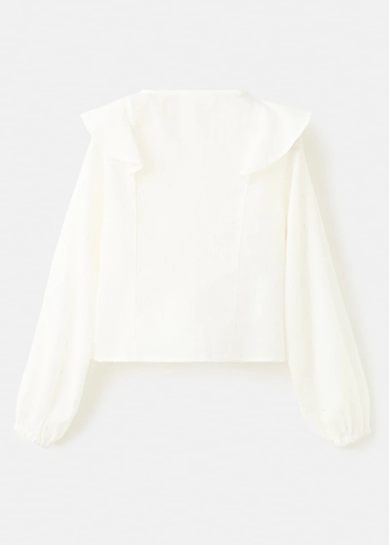 Crafted from cotton and lurex fabric, this garment features a straight design with a round neckline. The long sleeves have elasticated and ruched cuffs, while the decorative ruffles add a special touch. The front button fastening completes the design.