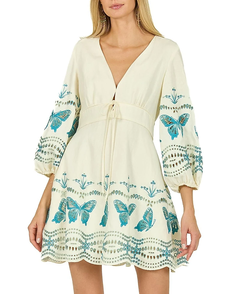 Secret Mission Priscilla Dress.Color:Creme with Multi Blue Embroidery.Size:S.Material:Garment: 100% LinenLining: 100% Cotton.Dresses.